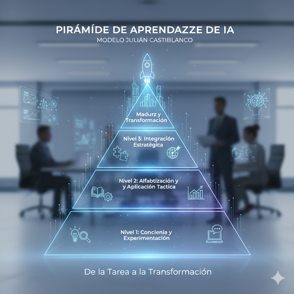 Para navegar esta complejidad, se necesita más que curiosidad; se necesita una metodologÃa. Precisamente para eso, he desarrollado La Pirámide de Aprendizaje de IA, un marco de trabajo probado que guÃa a las organizaciones en su viaje desde los primeros experimentos hasta la transformación total de su negocio. Es un modelo diseñado para construir capacidades de manera lógica y sostenible, asegurando que cada paso se asiente sobre una base sólida.